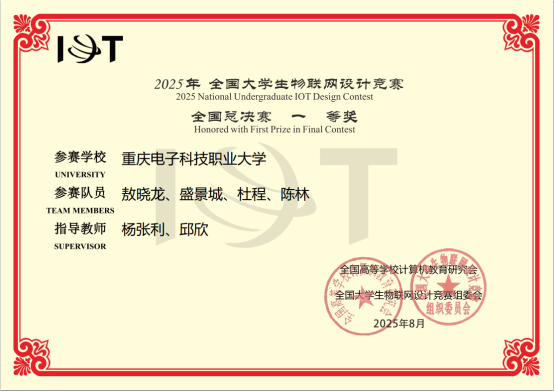 2025年8月27日至8月29日,2025年(第12届)全国大学生物联网设计竞赛在浙江大学举行,重庆电子科技职业大学材料与环境工程学院首次组建代表队,经过在贵州大学举办的华中及西南分赛区选拔赛,以及决赛答辩和演示两个环节的评审,与哈尔滨工业大学、上海交通大学、武汉大学等同台竞技,学院代表队获得全国一等奖的好成绩。