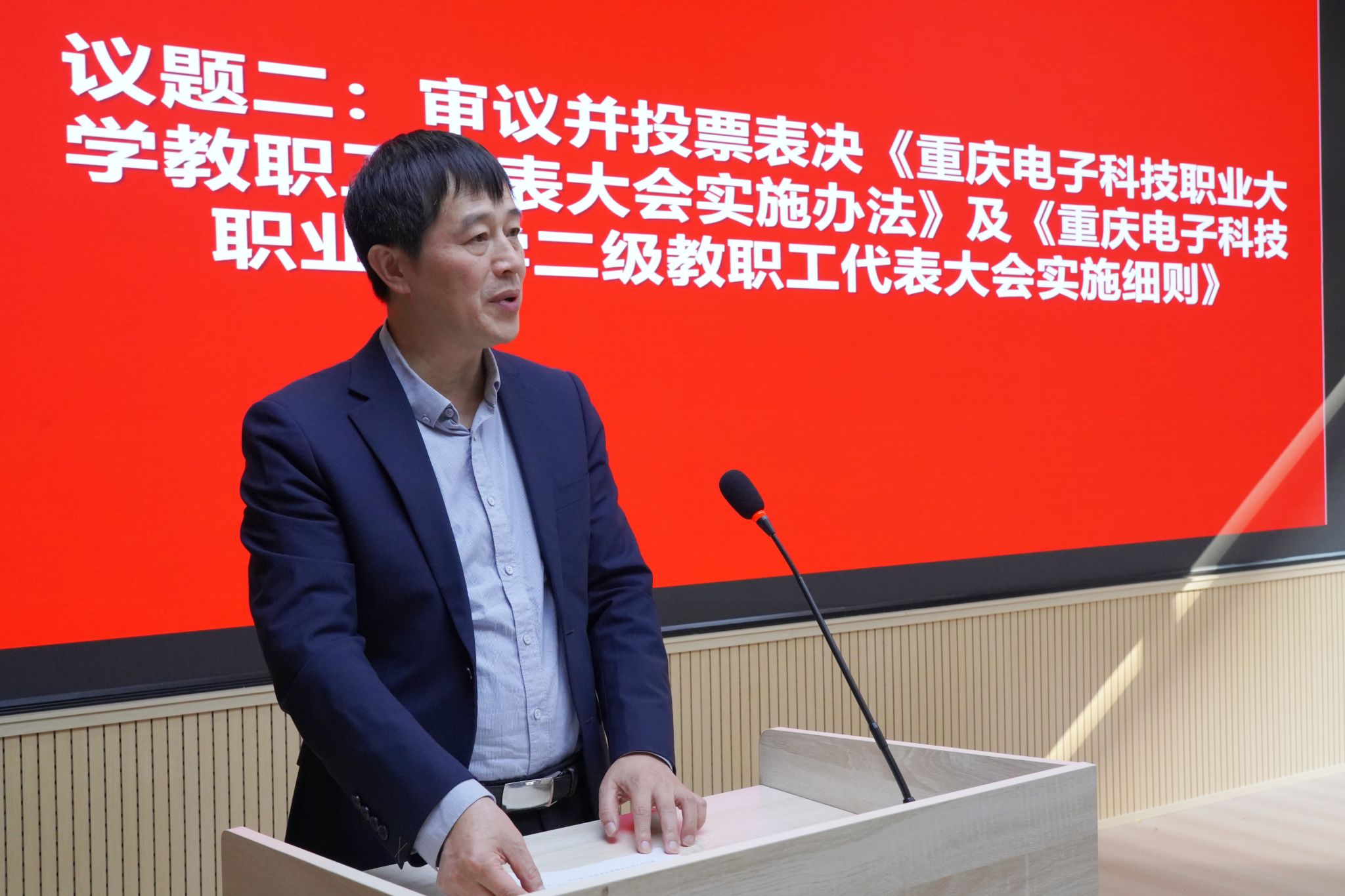 在后续议程中,大会审议并表决通过多项事关教职工切身利益与工会发展的重要制度文件,包括《重庆电子科技职业大学教职工代表大会实施办法》《重庆电子科技职业大学二级教职工大会实施细则》《重庆电子科技职业大学新进人员试用期管理办法》及“职称申报评审系列制度”。为帮助代表们精准把握制度内涵,党委教师工作部副部长贺彬恢对相关办法、制度的制定背景、核心内容及实施要点作了详细解读与说明。审议过程中,全体代表以高度的责任感和主人翁精神积极建言,严肃履行民主权利,充分彰显了民主决策、科学决策的鲜明导向。