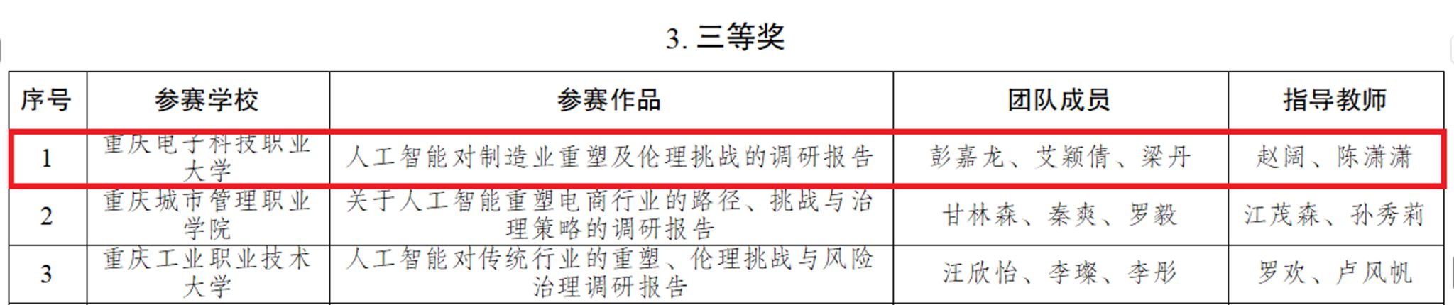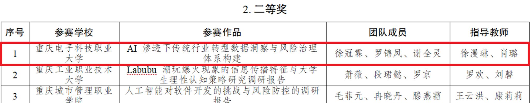 近日,重庆市教育委员会发布了《关于2025年重庆市大学生信息素养大赛获奖情况的通报》(渝高教函〔2026〕5号),我校代表队喜获高职高专院校组团体一等奖、二等奖各一项,团体三等奖两项,我校荣获大赛突出贡献集体称号。