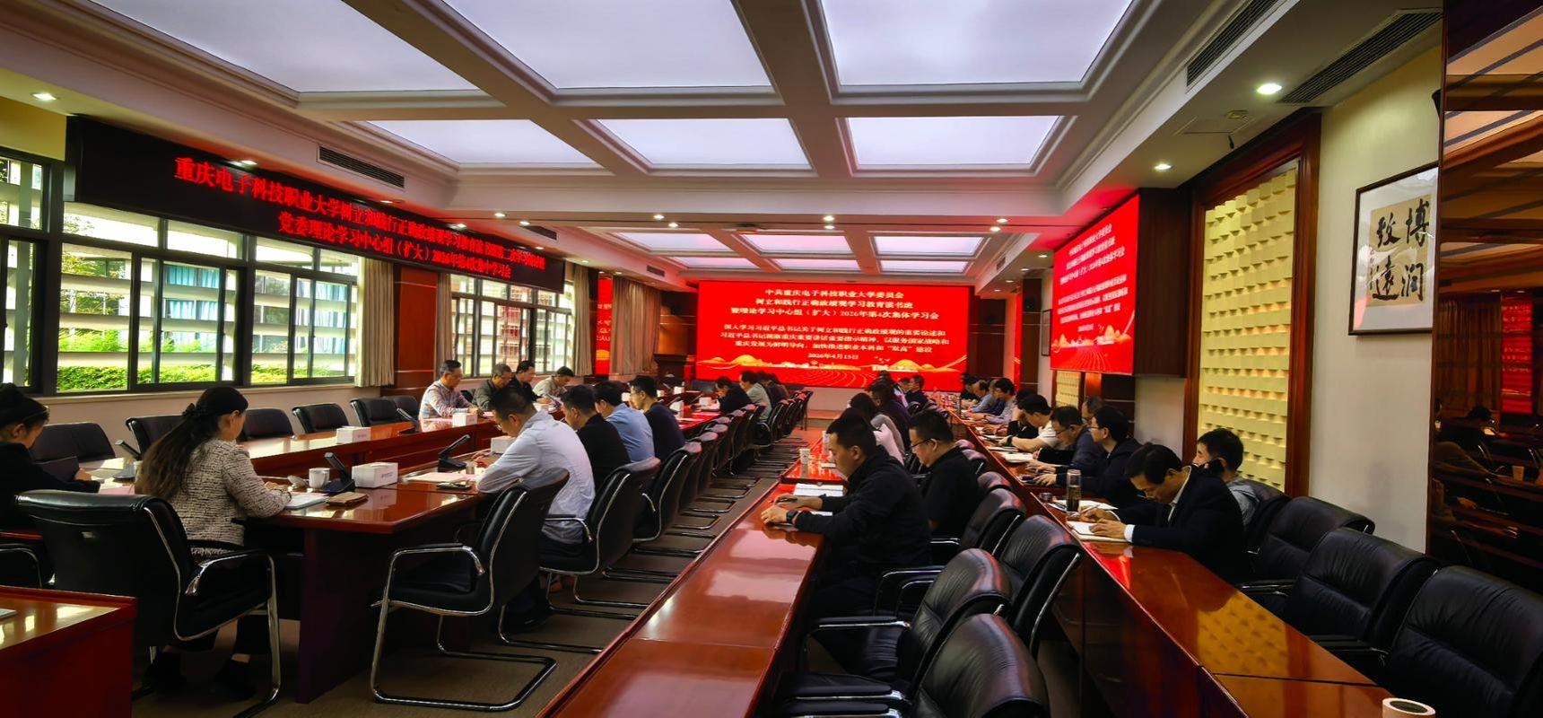 4月15日下午,学校在博润厅召开树立和践行正确政绩观学习教育读书班第二次学习研讨暨党委理论学习中心组(扩大)2026年第4次集中学习会,深入学习习近平总书记关于树立和践行正确政绩观的重要论述和习近平总书记视察重庆重要讲话重要指示精神,坚定不移肃清流毒影响,以服务国家战略和重庆发展为鲜明导向,加快推进职业本科和“双高”建设。校党委书记张伟主持会议,全体在家校领导、处级干部及专职组织员参加学习。