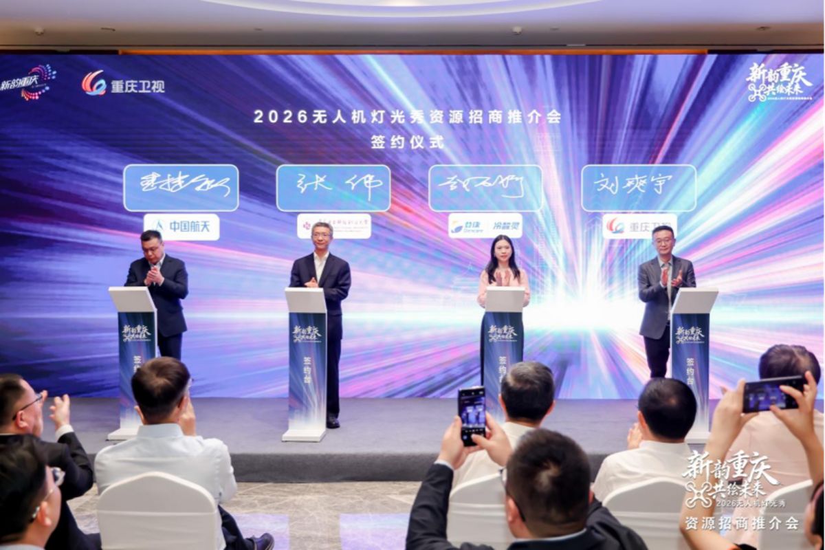签约仪式上,长安集团、航天时代、腾讯、华为及我校等8家单位完成集中签约,各方将在技术、内容、传播、产业等领域深度合作,共同孵化行业标杆IP。活动现场,“新韵重庆”发布了2026年度围绕理念、技术、内容、场景、营销、传播六大维度的迭代升级计划,推动项目从“常态展演”向“城市IP”全面跃升。