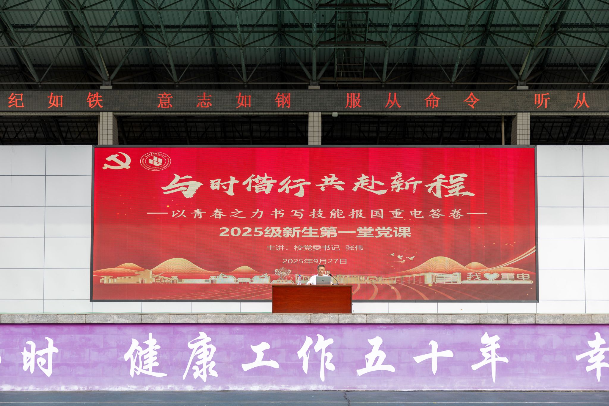 9月27日,学校党委书记张伟以“与时偕行,共赴新程”为题,为2025级新生上第一堂党课。