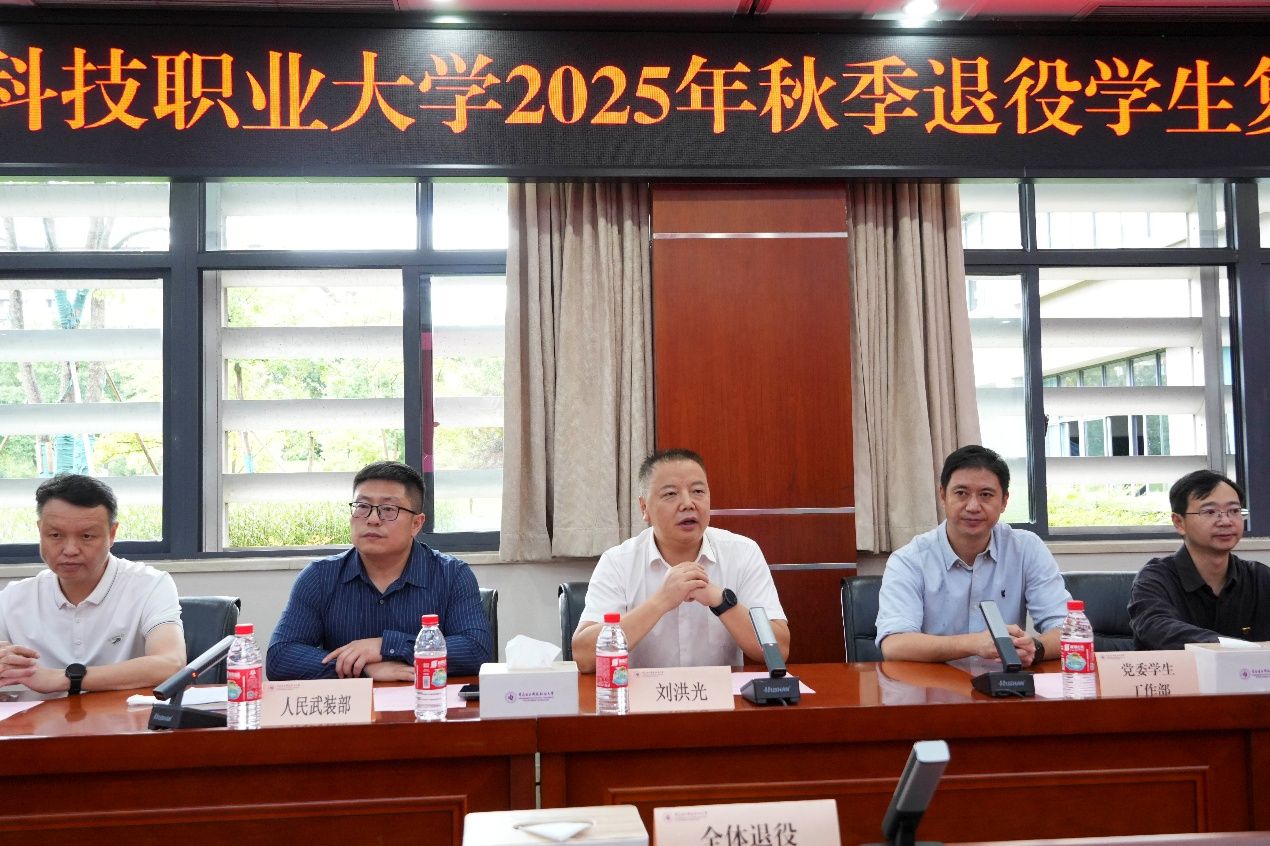 戎光归校启新程,启航共赴青春约。2025年10月17日,重庆电子科技职业大学召开2025年度秋季退役军人大会。副校长刘洪光、人民武装部、党委学工部、教务处和7个二级学院领导、2025年秋季全体退役复学学子参加会议。本次大会由人民武装部部长田艾主持。
