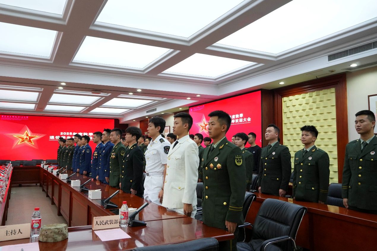 在雄浑激昂的《义勇军进行曲》旋律中,2025年度秋季退役军人大会正式拉开帷幕。60名退役复学大学生参加此次欢迎大会。首先,由电子与物联网学院的徐佳豪同学作为退役复学学生代表,代表2025年度秋季全体退役复学学生及退役复学专升本新生进行发言。表态未来将以军人本色投入学习生活,传递退役军人正能量、践行“若有战,召必回”誓言。
