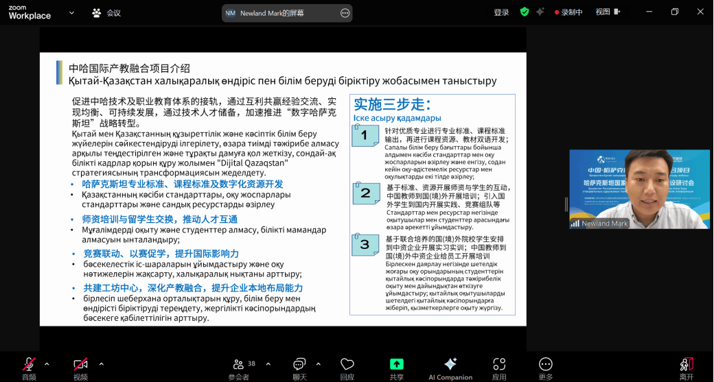 会议最后,中国-哈萨克斯坦国际产教融合项项目经理马晓峰详细介绍了项目实施计划及工作机制。