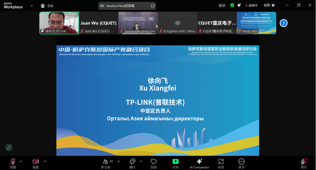 接着,中方企业代表、TPLINK中亚负责人徐向飞发言,他表示,随着中亚地区信息产业的蓬勃发展,网络与数字化技术人才需求急剧上升。企业愿与院校共建实训实验室、联合培养专业技术人才,推动教育资源与产业需求的高效对接。