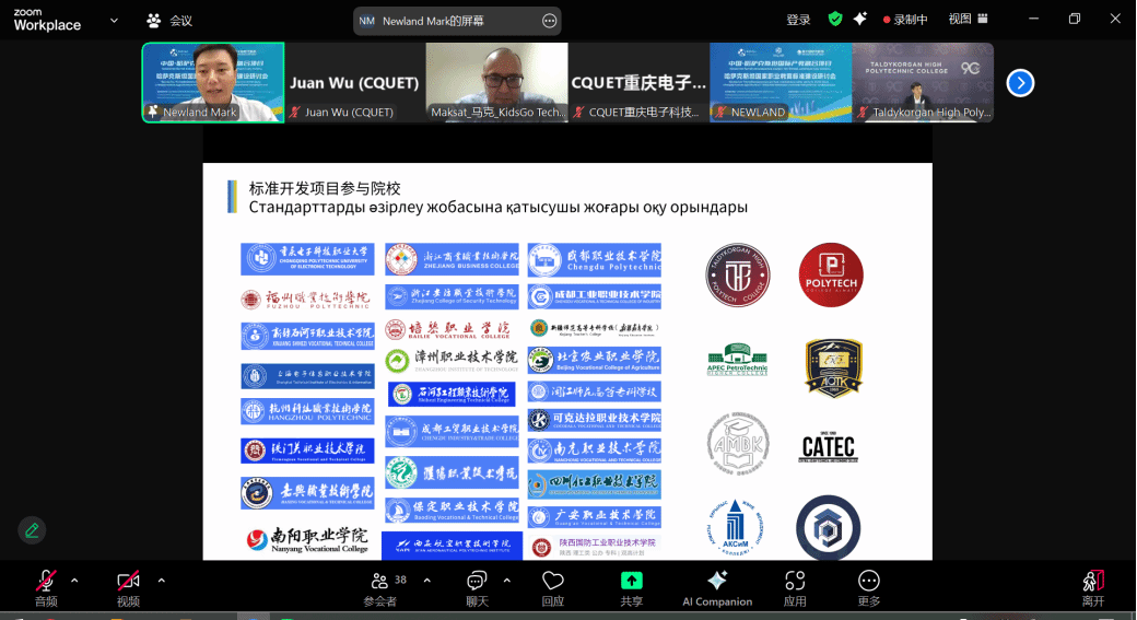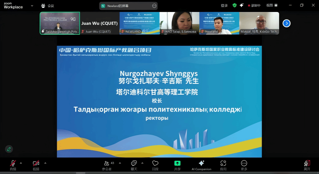 随后,哈萨克斯坦塔尔迪科尔甘高等理工学院校长辛吉斯在发言中表示,学院与中国多所职业院校保持紧密合作,已签署30余份合作备忘录,并计划于2026年开设人工智能专业。学院将积极参与本次标准共建项目,共同开发课程体系和双语教材,推动中哈两国职业教育的互通与共享。