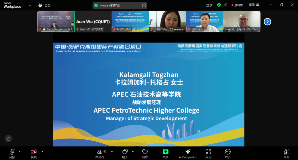 接着,哈萨克斯坦APEC石油技术高等学院战略发展经理托格占女士介绍了学院在石油技术与工程教育领域的专业优势及国际合作规划,并表示将积极响应本次国际化标准建设项目的合作倡议,参与相关专业标准和课程的联合开发。